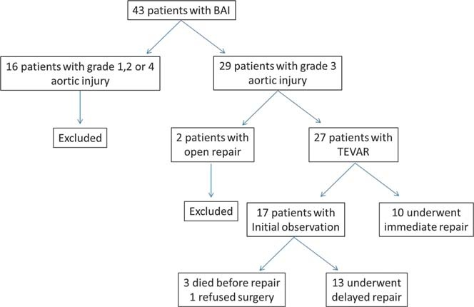 METHODS: All patients undergoing TEVAR for BAI at a single institution between March 2004 and March 2014 were reviewed (n = 43). Patients with Grade I, II, or IV aortic injuries as well as those who were repaired with an open procedure or who lacked preoperative imaging were excluded from the analysis. Demographics, intraoperative data, postoperative survival, and complications were compared.