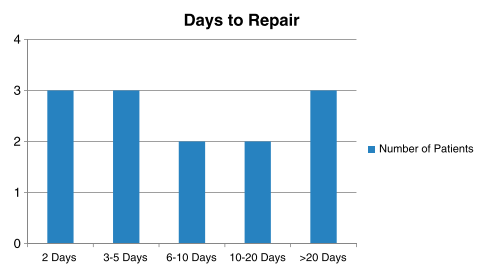 Demographics and outcomes were compared between the immediate repair group and the delayed repair group. Categorical data were analyzed using a contingency table with Fisher's exact test and two-tailed p values. Because of small sample size, nonparametric tests were used to analyze variables with skewed distribution. Mean with range was used instead of SD. A p < 0.05 was considered statistically significant. Statistical analyses were performed using GraphPad (La Jolla, CA).